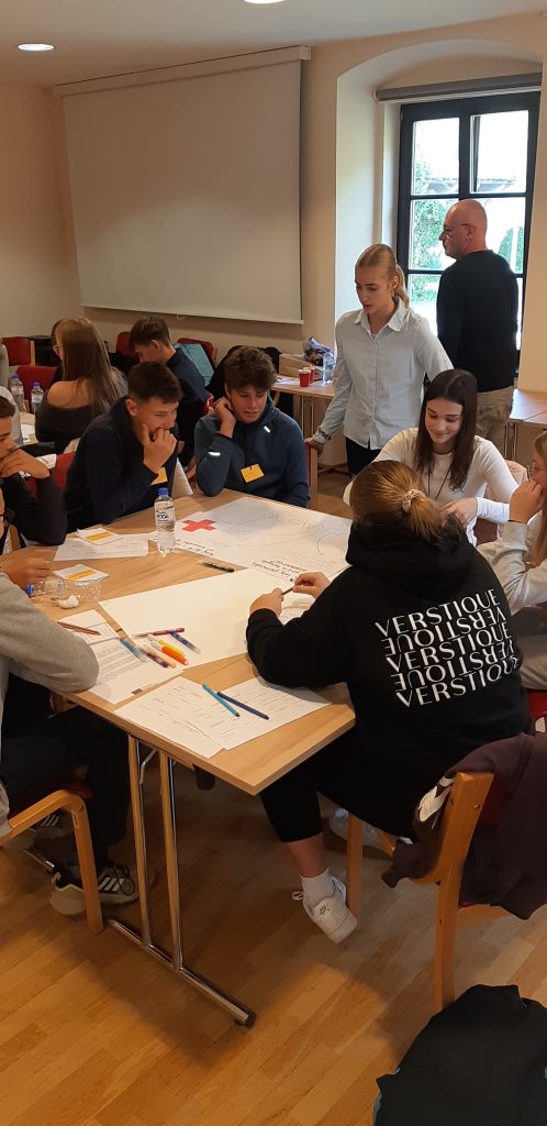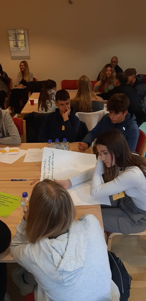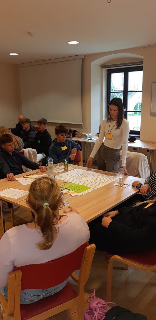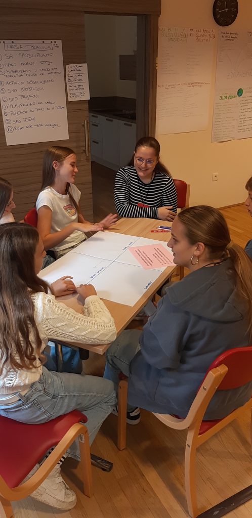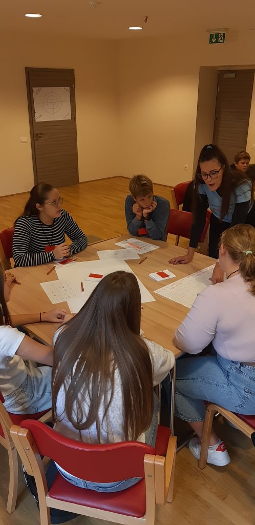 Pred pričetkom prve šolske ure smo se odpravili izpred šole in se sprehodili do dvorca Trebnik. Tam so nas v Christianini sobi že čakali predstavniki Zveze prijateljev mladine Slovenije, ki so bili hkrati tudi organizatorji dogodka. Razdelili smo se v skupine in pričeli z delom. Skozi najrazličnejše metode smo se spoznavali, razmišljali o pojmih zdravstvo, šolstvo, zeleni prehod in digitalizacija, zbirali informacije, se pogovarjali o tem, kaj želimo sporočiti odločevalcem, oblikovali plakate z našimi idejami, mislimi ter slednje predstavili tudi podžupanu občine Slovenske Konjice, Primožu Pokliču.