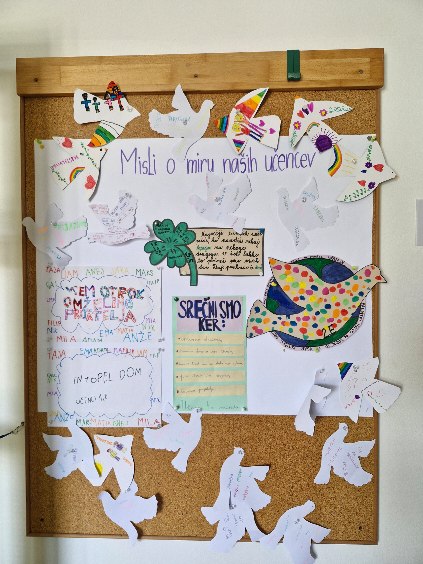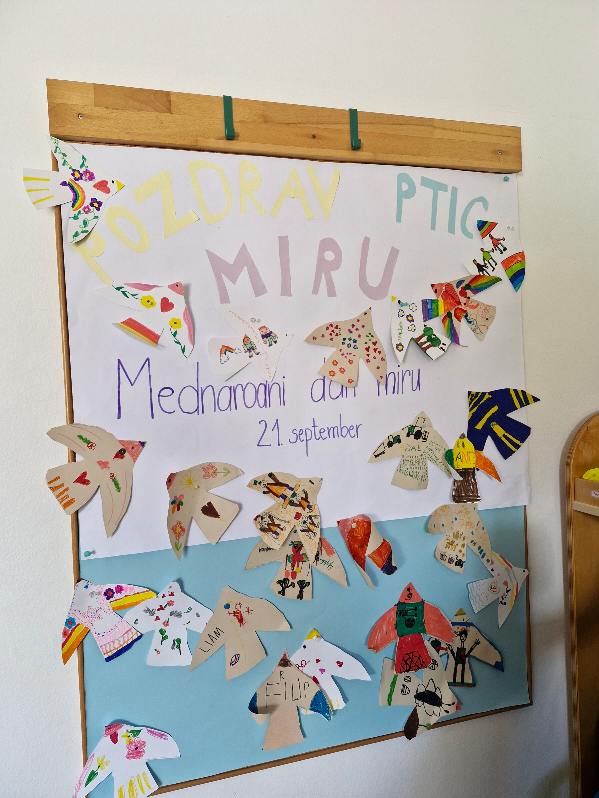 Na podružnici smo si za obeležitev dneva miru izbrali ponedeljek, 15. 9.2025, ko smo izvedli športni dan (štafetne igre), kjer so v ospredje prišle naše veščine sodelovanja, pomoči, fair playa, športnega navijanja in sprejemanja drug drugega. S praznovanjem mednarodnega dneva miru smo nadaljevali v podaljšanjem bivanju, kjer je vsak učenec izdelal svojo pticu miru. Vsaka ptica miru prinaša raznovrstna otroška sporočila o miru, ljubezni in prijateljstvu. Sporočila naših ptic miru smo ponesli med svoje šolske prijatelje.